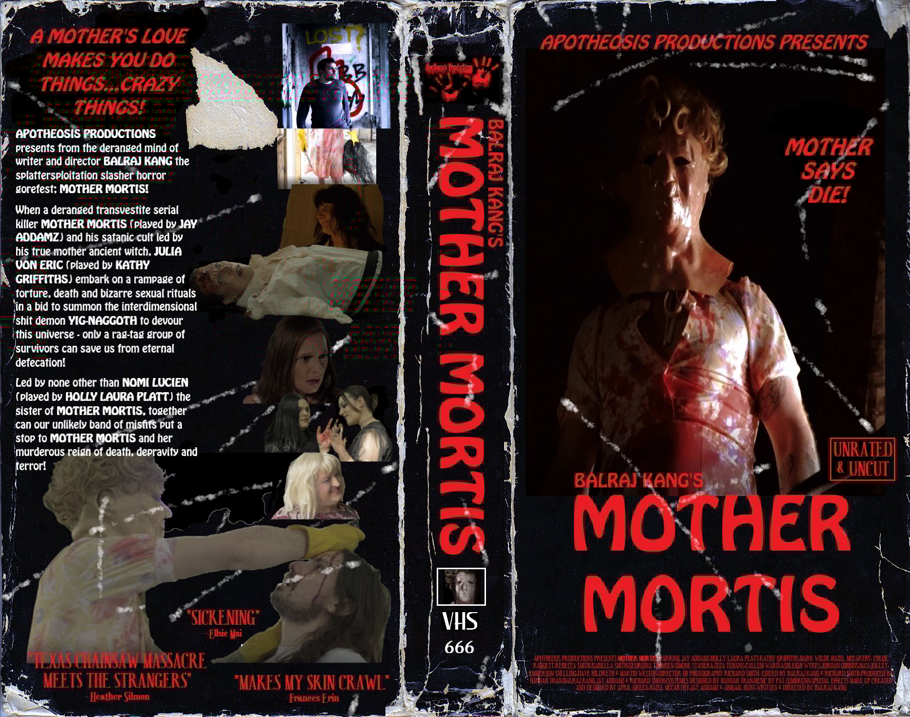 The debut feature from DIY horror filmmaker Balraj Kang brings you 80 minutes of pure terror as deranged serial killer Mother Mortis and his sadistic cult serve up a relentless practical FX bloodbath full of murder, torture, trash, black magic, bizarre sexual rituals, summonings of extraterrestrial entities, child sacrifice, giant killer insects, demons born from shit, wrench busting heads open, throat slitting, disembowelment, death by electrocution, heads being smashed to a bloody pulp with a rick and much more gore inside!